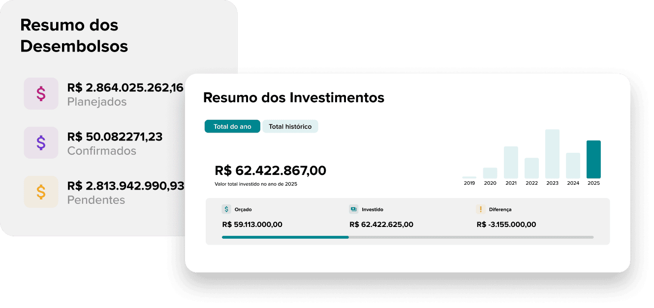 Visualize indicadores de investimento, acompanhe resultados e gere relatórios estratégicos pra gestão e governança.