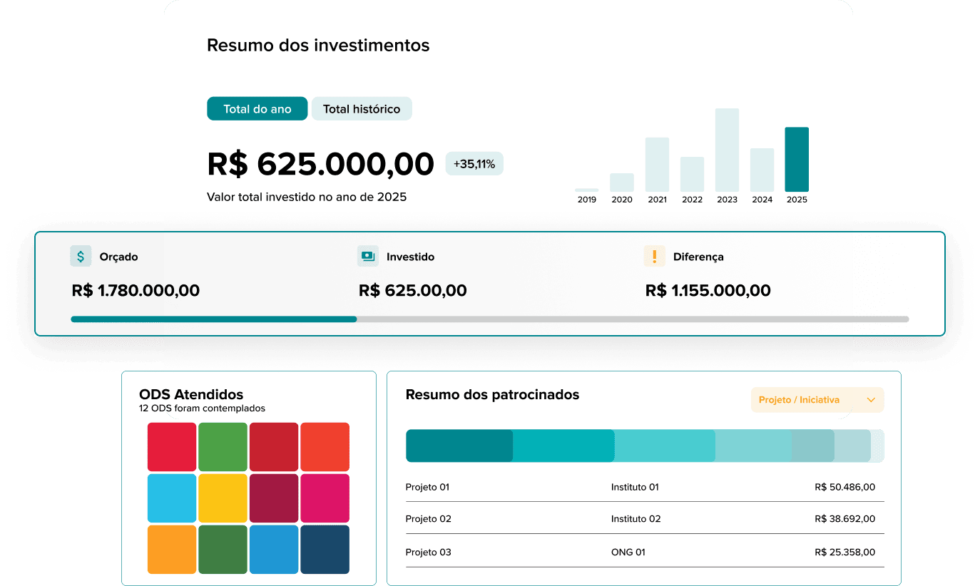 Organize e acompanhe de ponta a ponta todo o ciclo do investimento social em uma única plataforma.